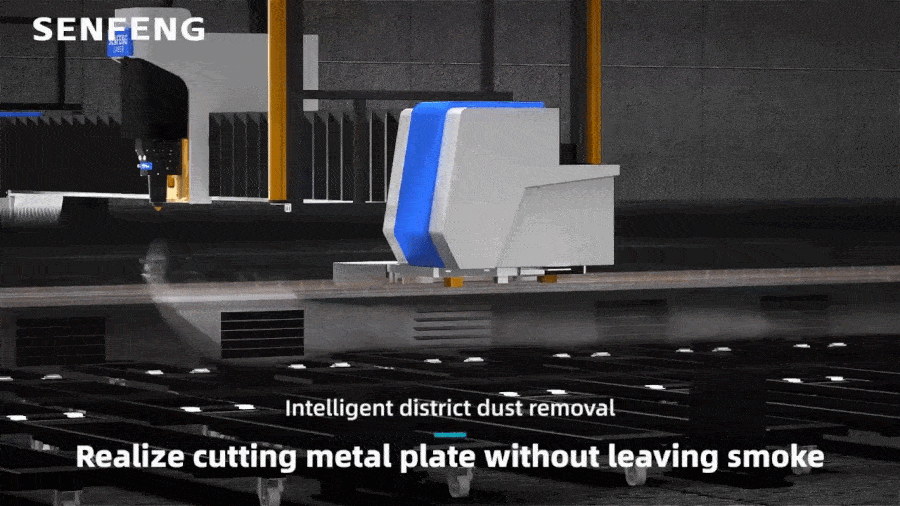 Dispozitivul de îndepărtare a prafului cu compartimentare poate localiza automat poziția de tăiere pentru a realiza evacuarea fumului pe zone. În același timp, un dispozitiv de evacuare cu diametru mare este instalat pe lateral pentru a îmbunătăți ventilația și evacuarea fumului în timpul funcționării, asigurând o evacuare mai eficientă a fumului.