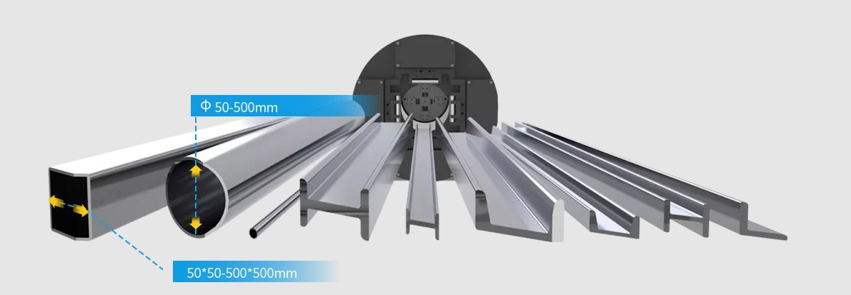 Poate procesa țevi rotunde, țevi pătrate, țevi rectangulare, profile L, U și H. Dimensiuni: țeavă rotundă Φ50mm-500mm, țeavă pătrată cu latura de 5050mm-500500mm. Greutatea maximă a unui singur tub: 2 tone.