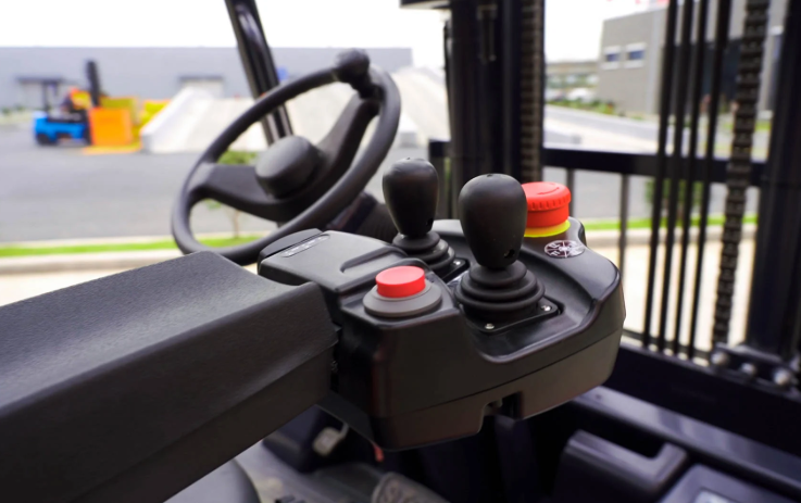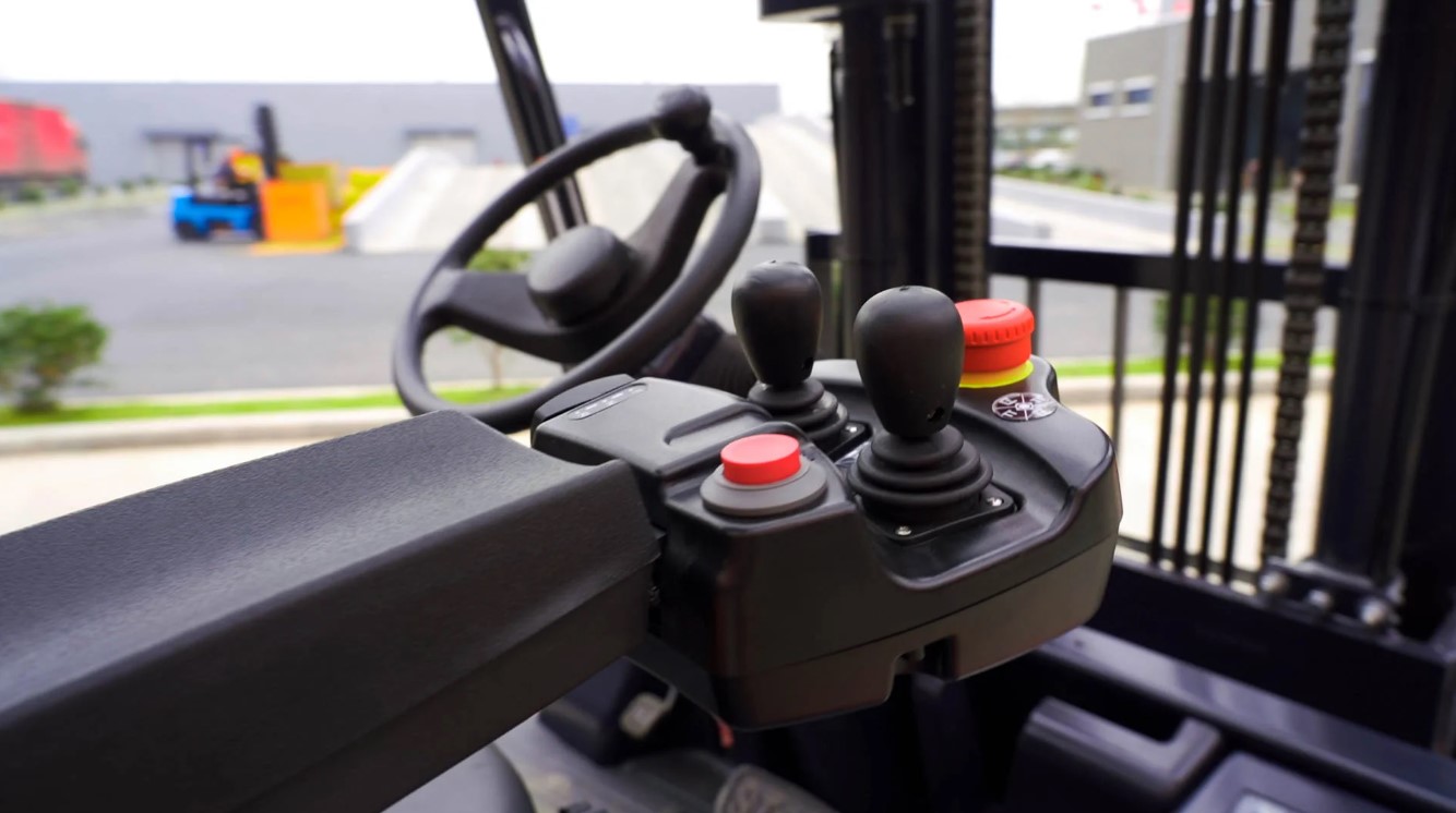 Modelul CPD50L1 poate fi echipat cu comenzi hidraulice de tip joystick în locul pârghiilor mecanice. Acestea sunt poziționate la capătul cotierii, permițând o operare precisă și ușoară cu vârful degetelor, îmbunătățind ergonomia pentru operator. Sistemul oferă control complet asupra funcțiilor hidraulice ale furcilor, inclusiv cea de-a patra cale, direcția de deplasare (F-N-B), claxonul și un buton de oprire de urgență.